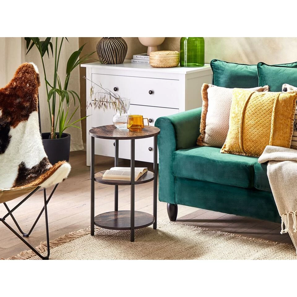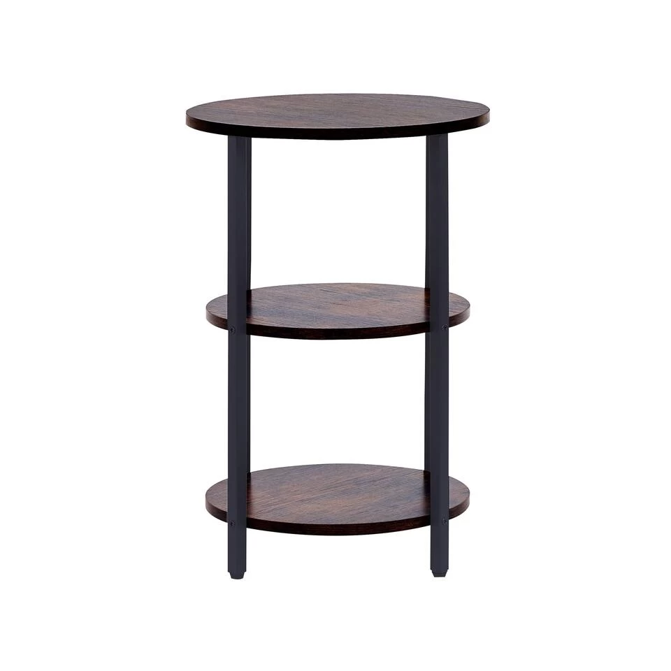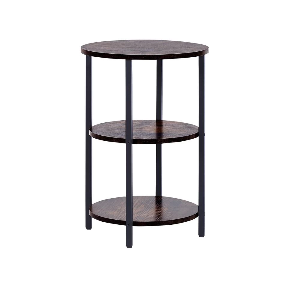 Industriële ronde bijzettafel met planken. Met deze ronde salontafel maak je je huis nog praktischer en elegant. Je kunt het naast de bank zetten om je drankjes en hapjes bij de hand te houden of het in de hal gebruiken om je decoratieve accessoires ten toon te stellen.