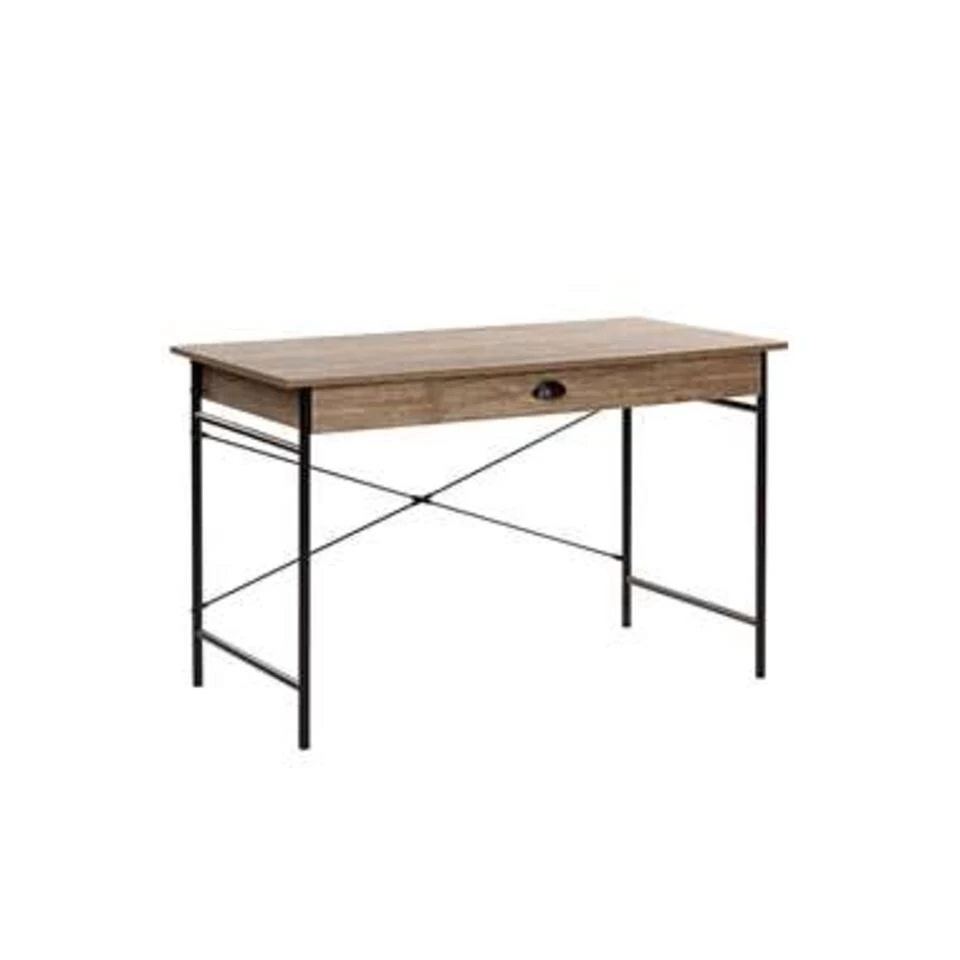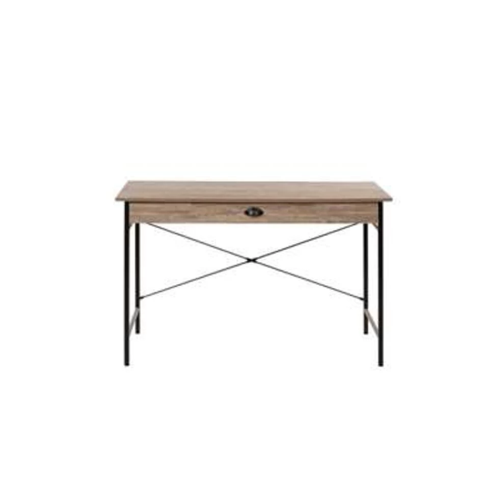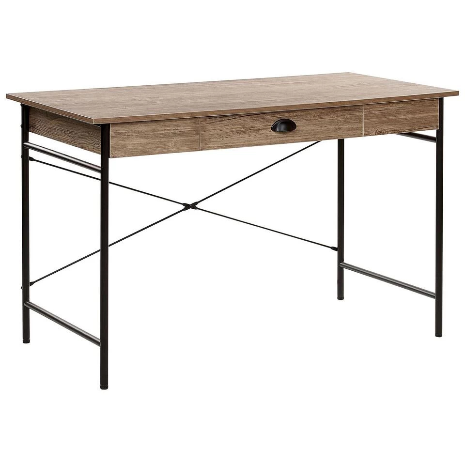 Modern thuis-bureau met metalen frame en lade in een industrieel design. Of het nu gaat om een tafellamp, computer of boeken – op het brede werkblad is genoeg ruimte. Extra opbergruimte wordt geboden door de gemakkelijk uittrekbare, ruime lade met bijpassende handgreep, die zich in het midden onder het tafelblad bevindt. Dankzij de deels instelbare doppen onder de stabiele, gepoedercoat, stalen poten is er een goede bescherming van de ondervloer.
