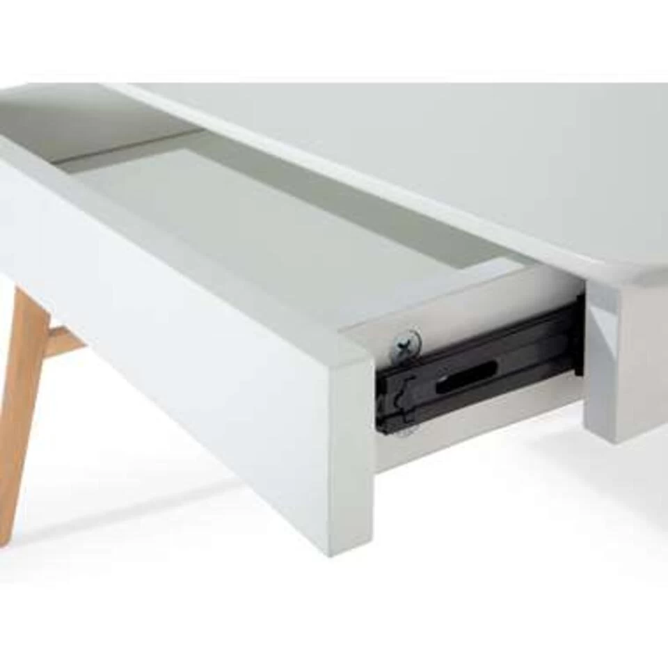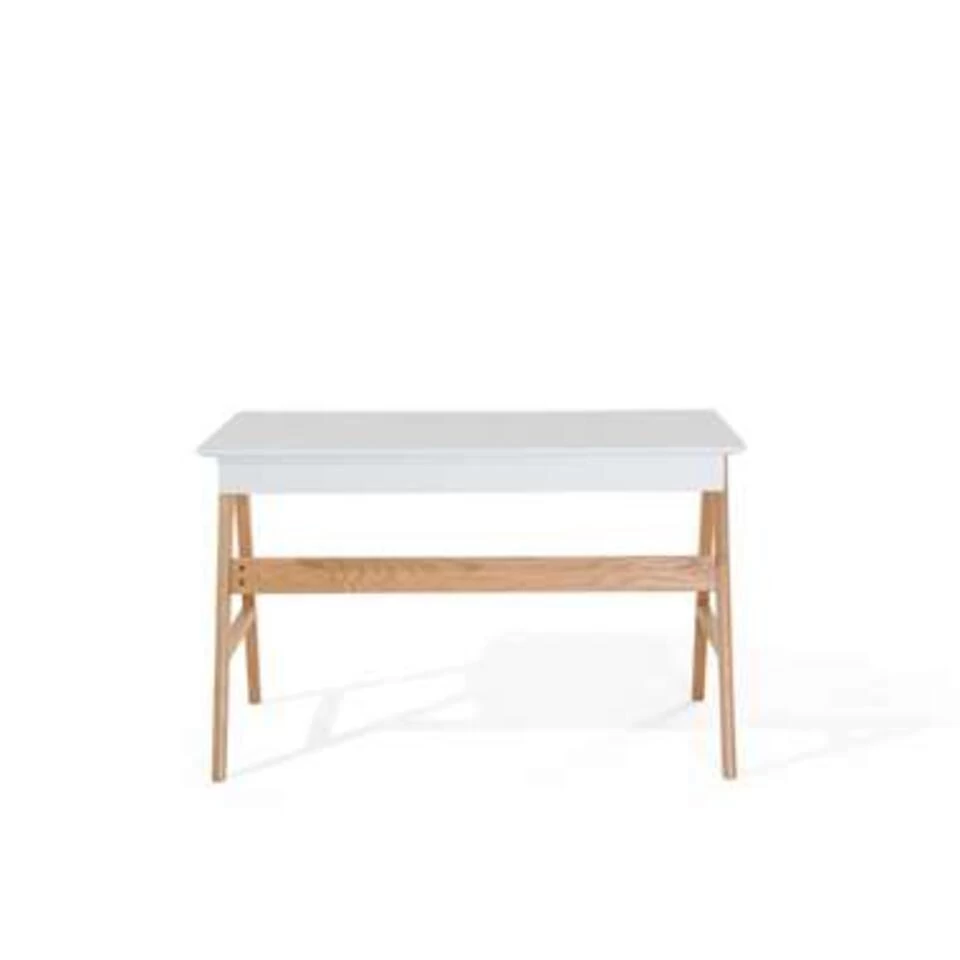 Functioneel en veelzijdig bureau. Ben je op zoek naar een bureautafel van een compact formaat, bijvoorbeeld als computertafel of als bureau voor je schoolgaande kinderen om op een comfortabele manier hun huiswerk te maken? De twee lades onder het tafelblad zorgen ervoor dat je bureau er na het werken altijd netjes en opgeruimd uit blijft zien. Dit bureau staat op twee schuinstaande en A-vormige poten van hoogwaardig hout. Aan de achterkant zorgt een brede dwarsbalk voor extra stevigheid en stabiliteit. Het tafelblad en de laden zijn gemaakt in een frisse lichte kleur die smaakvol contrasteert met de stabiele tafelpoten. Deze bureautafel staat uitstekend als je hem tegen de muur zet, maar is stevig genoeg om ook los te staan.