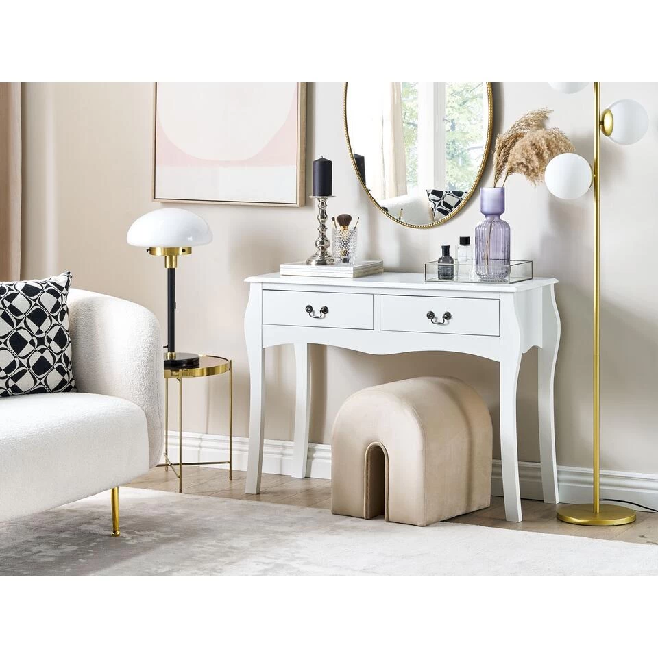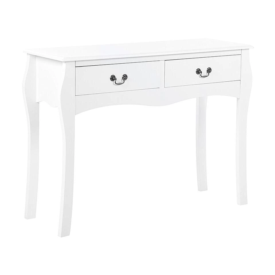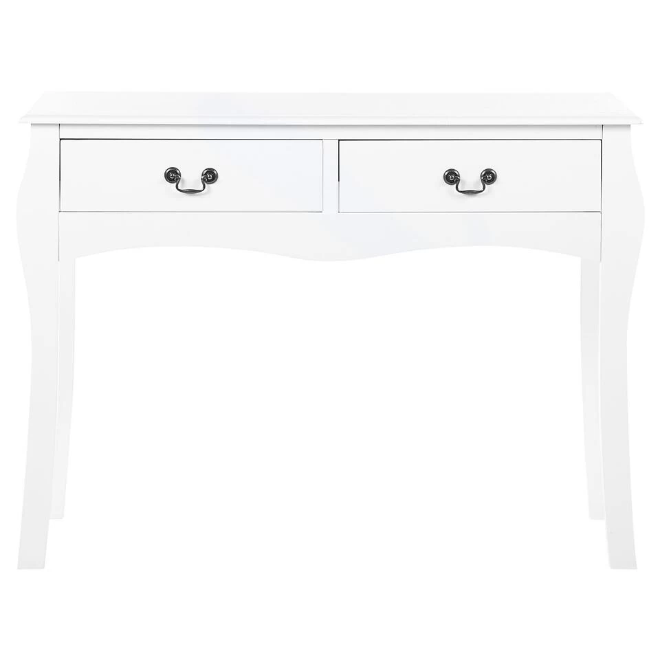 Consoletafel in landelijke stijl. Deze rustieke tafel is een functionele en decoratieve toevoeging aan elke hal of woonruimte en vormt een ideale achtergrond voor boeken, decoraties en persoonlijke stylingaccenten. Met een slank ontwerp met cabrioletpoten en een geschulpte voorkant, biedt dit stuk een vintage, tijdloze uitstraling. Uitgerust met twee ruime lades, beide versierd met klassieke metalen handgrepen, past deze tafel perfect bij elke Franse landelijke stijl en luxe inrichting.
