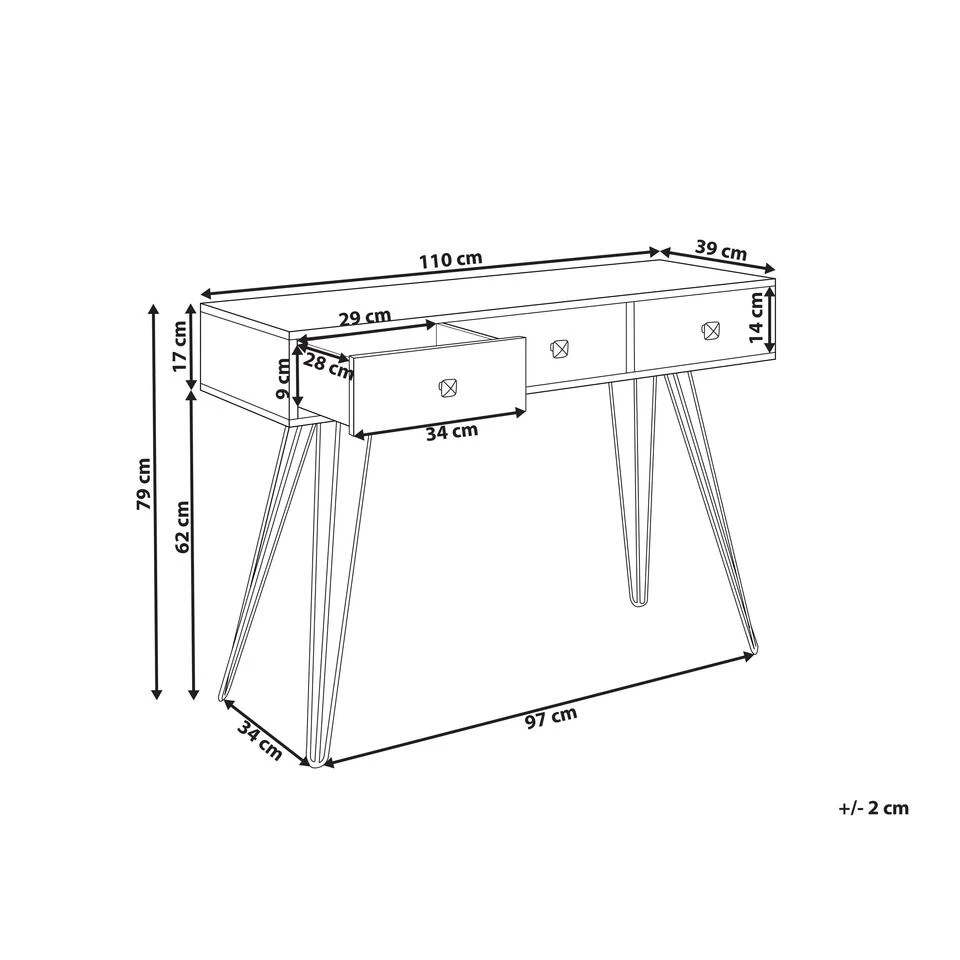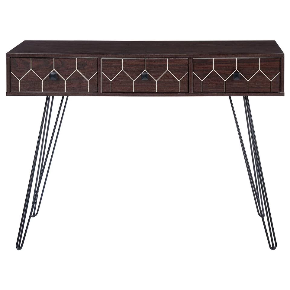 Moderne consoletafel met uitgesneden patroon. De combinatie van het klassieke donkerhout met het uitgesneden patroon aan de voorkant met de slanke poten maken deze consoletafel een elegant en modern meubelstuk. Hij is gemaakt van duurzaam spaanplaat met 3 lades en een wijd rechthoekig tafelblad, perfect om je spullen in op te slaan of decoraties op te plaatsen zoals foto’s, beeldjes of vazen met bloemen. De stalen poten garanderen stabiliteit. Het gehele ontwerp zal zeker de aandacht trekken.
