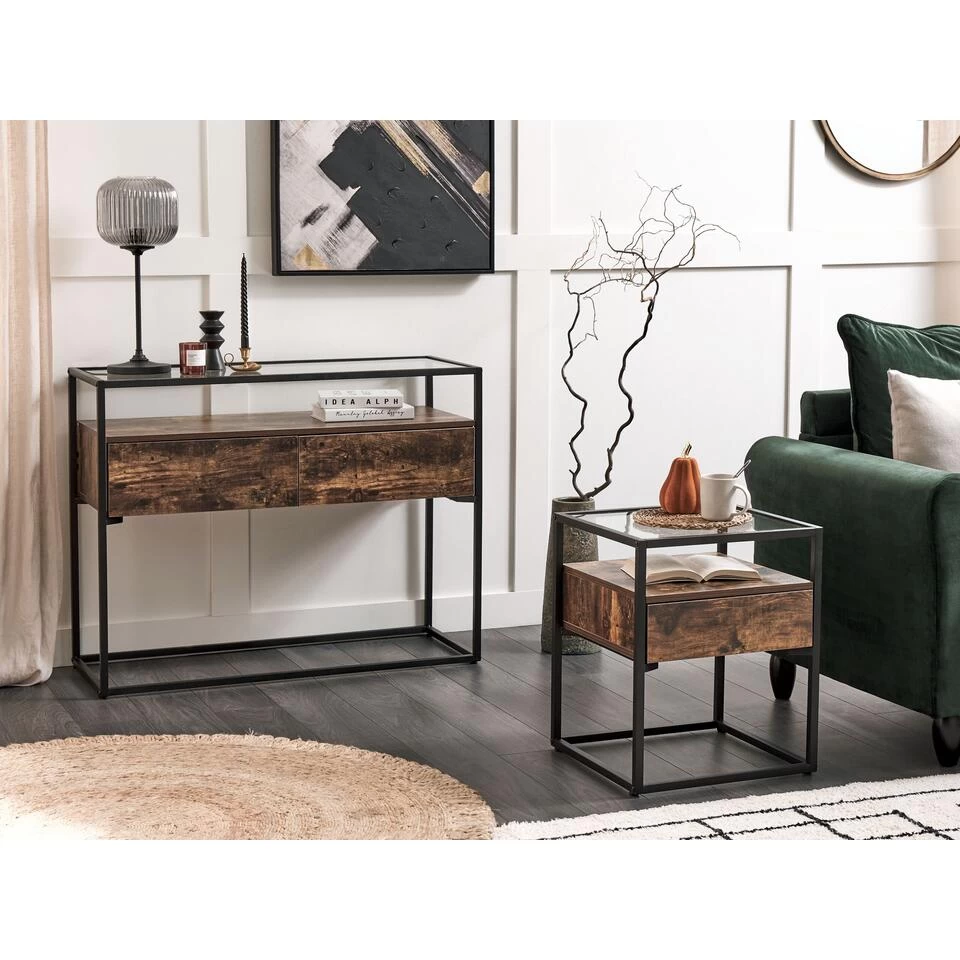 Consoletafel met lades. Fleur je ruimte op met deze elegante consoletafel in donkere houttint. Een perfecte aanvulling op een woonkamer, hal of slaapkamer, het biedt praktische opbergruimte en brengt een vleugje industriële stijl. De tafel is ontworpen met twee diepe lades, perfect om al je spulletjes op één plek te bewaren, en een glazen tafelblad dat prachtig een tafellamp of ingelijste foto’s zal weergeven. Het metalen frame zorgt voor stabiliteit en geeft een strakke uitstraling.