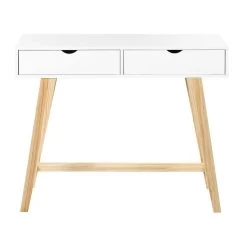 Tafel met lades in Scandinavische stijl. Als je de voorkeur geeft aan een Scandinavisch of minimalistisch interieur, dan past deze consoletafel zeker bij je interieur. Het moderne design van het meubel wordt geaccentueerd door het witte blad en de lades, terwijl de houten poten in een lichte tint voor een gezellige toets zorgen. Met zijn extra opbergruimte is de consoletafel een praktische toevoeging aan je woonkamer of hal, maar hij kan ook dienst doen als kaptafel in je slaapkamer.