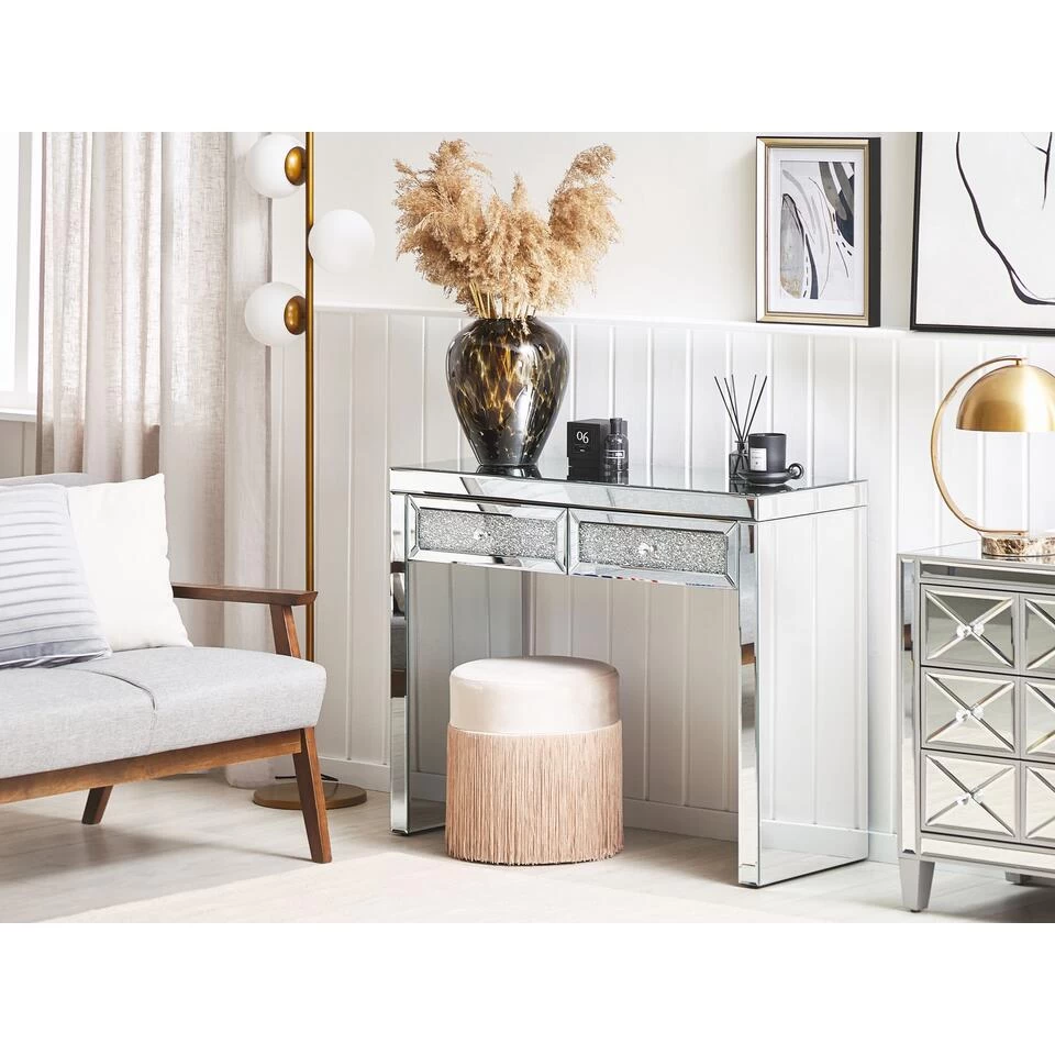 Elegante kaptafel met spiegeleffect en kristallen beslag. Een console is een veelzijdig accessoire dat in elke ruimte kan worden toegepast. Dankzij de spiegelende afwerking kun je het in elegante woon- of slaapkamers plaatsen, en met de 2 stijlvolle lades kun je kleine benodigdheden bij de hand houden. De gebruikte materialen zorgen ervoor dat het lang mooi blijft.