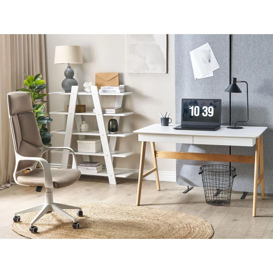 Minimalistisch bureau met bijpassende boekenkast. Deze stijlvolle maar functionele kantoorset past in elk interieur met een modern geïnspireerd ontwerp. Het bureau is gemaakt van stevig samengesteld hout en staat op massief, gelakte eikenhouten poten voor uitzonderlijke duurzaamheid en stabiliteit. 5 ruime planken van de boekenkast die in de set zit, bieden voldoende ruimte voor al je favoriete boeken, decoratieartikelen, fotolijsten en meer. Zet de meubels neer in je woonkamer, slaapkamer of thuiskantoor en geniet van een mooie, minimalistische look met topfunctionaliteit.