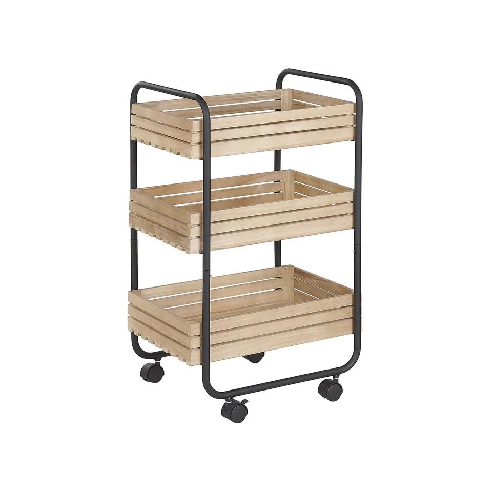 Keukentrolley met 3 houten kratten. Altijd te weinig ruimte om dingen in de keuken of in de badkamer te bewaren? Schaf een keukentrolley aan, die je overal in huis kunt gebruiken als tijdelijke, gemakkelijk verplaatsbare opbergruimte. De 3 planken bieden voldoende opbergruimte voor alles wat je maar wilt: gereedschap, keukengerei of andere items. Het is gemaakt van ruwe natuurlijke materialen en daarmee een klassiek voorbeeld van een industriële stijl.