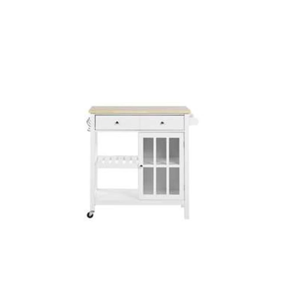 Moderne keukentrolley in Scandinavisch design. Deze keukentrolley is een aanwinst voor elk huishouden. Dankzij zijn veelzijdigheid werkt hij uitstekend als klein kookeiland, maar ook perfect voor het serveren van gerechten en dranken in de woonkamer. De serveerwagen is gemaakt van duurzaam MDF en heeft een ruim, houten blad met een lichte houtafwerking. In de ruime kast en lades passen gemakkelijk allerlei accessoires, terwijl de praktische wielen helpen om de kar door het huis te verplaatsen.