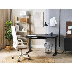 In hoogte verstelbaar bureau. Met dit moderne bureau verbeter je de kwaliteit van je werk. Het bureau is uitgerust met een LED-display en een intelligent mechanisme voor hoogteverstelling, waardoor het bureau in hoogte kan worden versteld tot wel vier verschillende niveaus. Dankzij het verstelmechanisme kun je zowel zittend als staand werken. Daarnaast zijn er USB- en USB C-type aansluitingen naast het bedieningspaneel van de tafel. Een handige doos die opent met een druk helpt om de werkruimte te ordenen. Het tafelblad is gemaakt van hoogwaardig spaanplaat met een houtachtige afwerking en het frame is gemaakt van staal, wat stabiliteit en duurzaamheid garandeert.