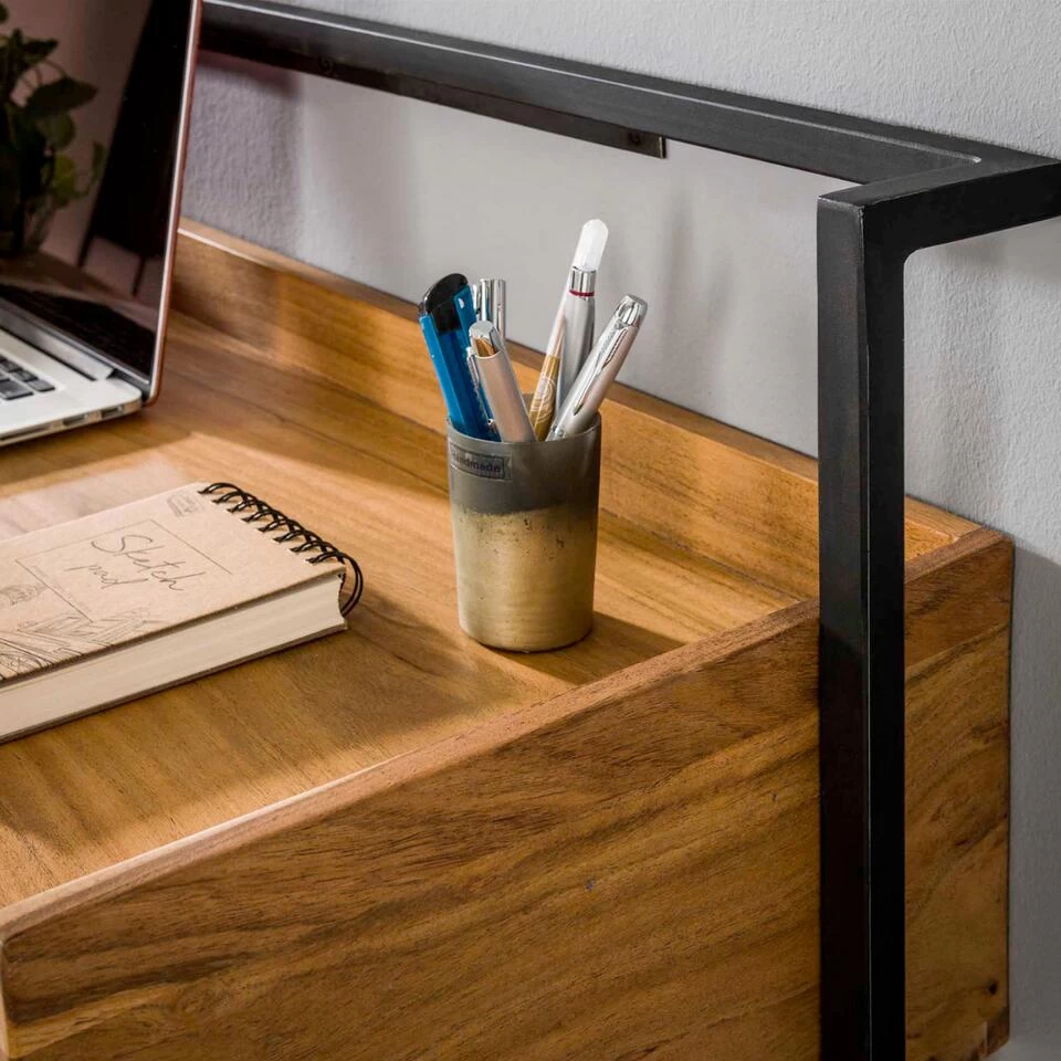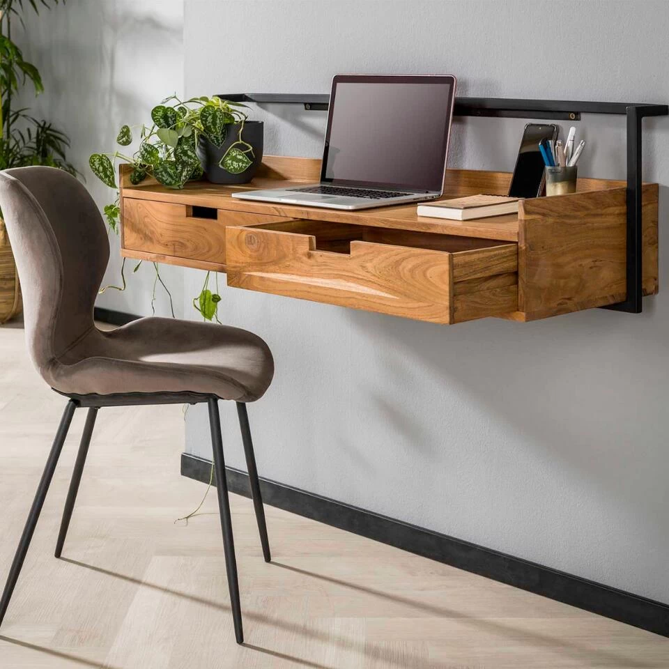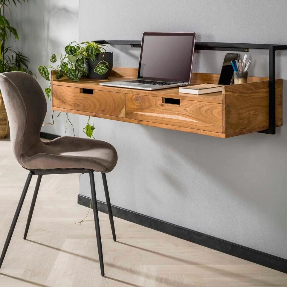 Bureau Alex is erg populair dankzij zijn unieke ontwerp, waardoor hij aan de wand gemonteerd kan worden! Minder ruimte in huis? Dan is dit bureau de ideale oplossing. Dit meubel is namelijk voorzien van een strip met meerdere schroefgaten, zodat u altijd verzekerd bent van een hoogte die perfect bij u past. Het bureau is diep genoeg, bijna 40 cm, waardoor er voldoende plek overblijft om fijn achter te werken. Alex is uitgevoerd in prachtig naturelkleurig acaciahout met diverse kleurschakeringen en een mooie houtstructuur. Verder is hij uitgerust met een stevig gepoedercoat metalen frame voor een stoere finishing touch. De twee handige lades dragen bij aan de uitstraling van dit meubel en zorgen voor voldoende opbergruimte. Combineer bureau Alex ook met het andere items uit dezelfde serie voor eenheid binnen het interieur.