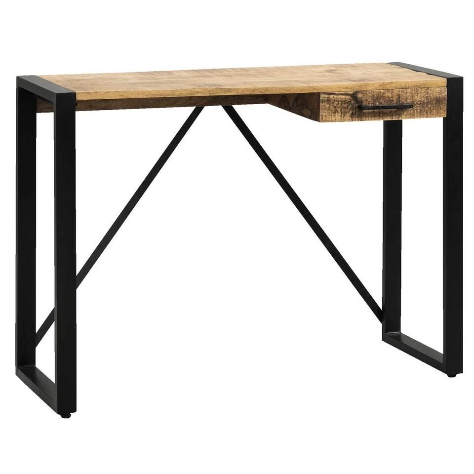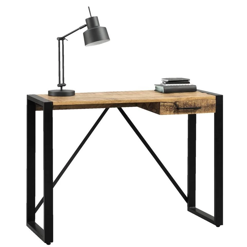Bureau Kyan heeft een landelijke en stoere look. Dit bureau is gemaakt van hout en metaal en heeft een afmeting van 78x110x40 cm. Losse spullen kun je opbergen in de lade (afmeting 8x35x38cm) onder het blad. Omdat dit bureau een stijlvolle uitstraling heeft, misstaat dit meubel niet in bijvoorbeeld je woonkamer.