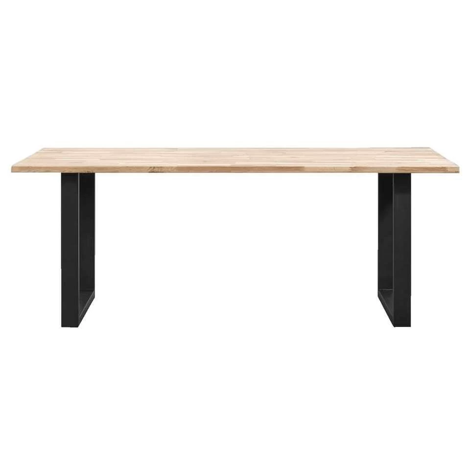 De eetkamertafel heeft een massief eiken tafelblad, sterk en met een mooie eikenprint. Daaronder zit een stevig metalen onderstel, in de vorm van een U. Hout met metaal is al enige tijd een stoere en populaire combinatie! Het tafelblad heeft een afmeting van 180×90 cm. De tafel heeft een hoogte van 74 cm en de ruimte tussen de poten is 134 cm. Let op met het kopen van bijpassende eetkamerstoelen, bijvoorbeeld qua breedte van de stoel en qua hoogte van de leuningen.Â
