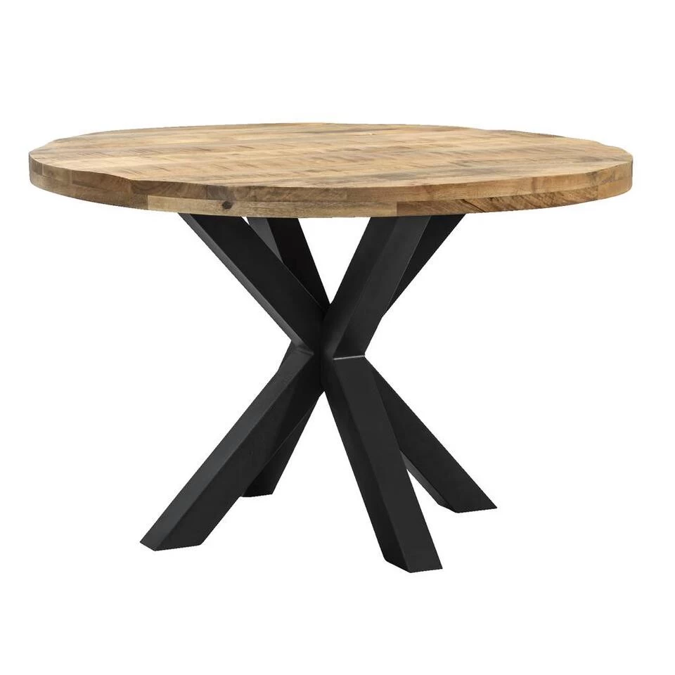 De eetkamertafel heeft een mangohouten tafelblad, sterk en met een stijlvolle en trendy look. Het spinpoot onderstel is stevig en gemaakt van metaal, waardoor vier stevige en robuuste poten ontstaan. Hout met metaal is al enige tijd een stoere en populaire combinatie! Het tafelblad heeft een diameter van 120 cm en is voorzien van een natuurlijke lak. De tafel heeft een hoogte van 78 cm. De hoogte tot de onderkant van het blad is 75 cm. Let dus op met het kopen van een bijpassende eetkamerstoelen met leuningen.