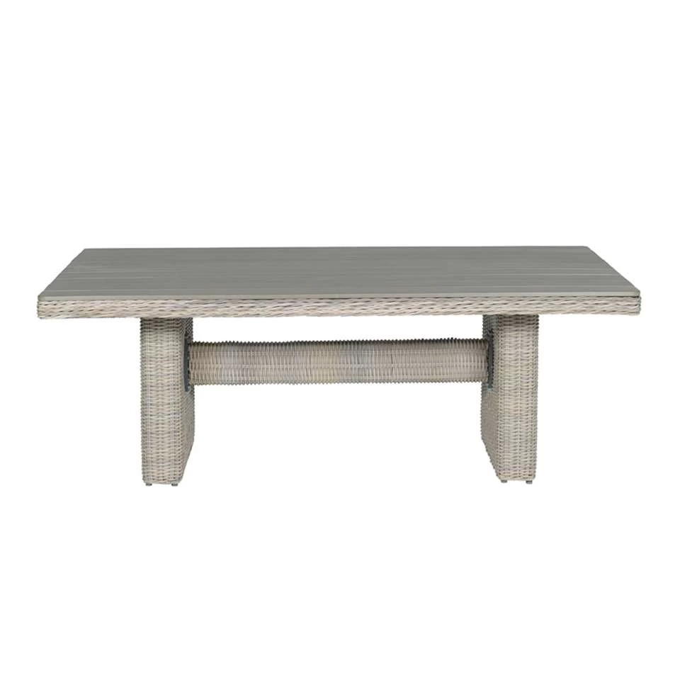 De Tennessee dining tafel is een heerlijke lounge dining tafel om te combineren met bijvoorbeeld de Tennessee loungebank of de comfortabele lounge stoelen. Deze tafel op hoogte is ideaal, want je kunt heerlijk loungen, maar ook dineren aan de tafel is mogelijk. De Tennessee dining tafel is vervaardigd uit een onderhoudsvrij aluminium frame met daaromheen hand gevlochten 6,5mm half rond kunststof wicker draad in de kleur vintage willow. Het tafelblad is gemaakt van polywood ‘houtlook’ latten, dit is onderhoudsvriendelijk kunststof. De hoogte tot de bovenkant van het blad is 66,5cm. De Tennessee serie is enorm populair, waardoor er daadwerkelijk aan alles is gedacht. Zo zijn er niet alleen tafels, maar ook banken, open banken (waarmee je een hoekbank opstelling kunt creëren), lounge stoelen, poefjes, tussen elementen en voetenbanken. Zo is er voor iedere type tuin wel een passende set opstelling te maken. En natuurlijk zijn al deze artikelen leverbaar in diverse kleurstellingen. De afmetingen van deze tafel zijn: L 180 x B 100 x H 66,5 cm.