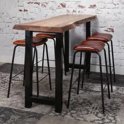 Deze trendy bartafel is voorzien van een 6 cm dik acacia blad en heeft een echte boomstam uitstraling. Het metalen frame is netjes afgewerkt met een zwarte poedercoat finish. De tafel is afgelakt met een blanke lak tegen vocht en voor een natuurlijke uitstraling. Deze bartafel is ook uitgevoerd in een eetkamertafel op drie verschillende maten, namelijk 165 cm, 200 cm en 240 cm.