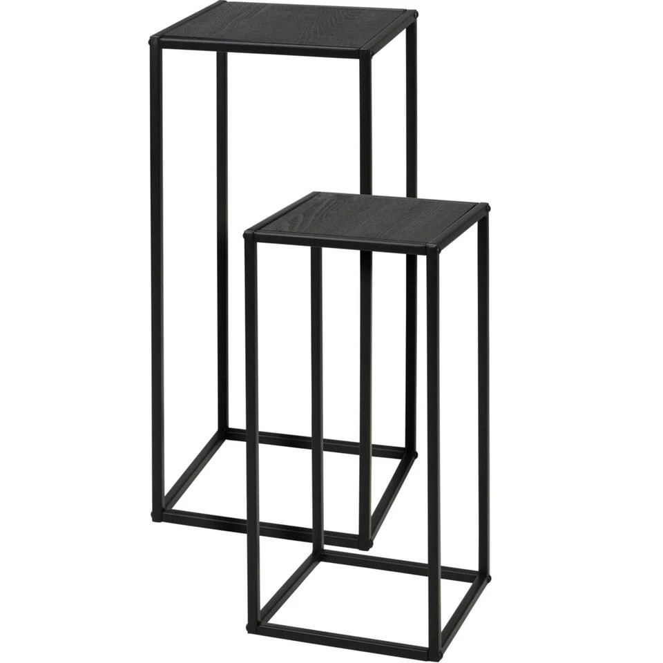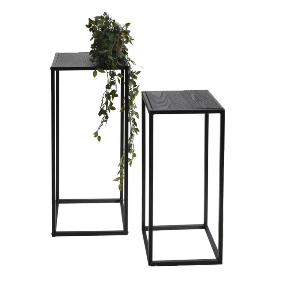 Home and Styling Bijzettafels set, 2-delig in het zwart met grijs houten plateaus. Een laag en hoger tafeltje. Deze set bestaat uit 2 vierkante tafels. De grote tafel is ca. 27 x 27 cm breed en ca. 60 cm hoog. De kleine tafel is ca. 24 x 24 cm breed en ca. 50 cm hoog. Door dit formaat passen beide tafels in elkaar, waardoor ze gemakkelijk opgeruimd kunnen worden en het ruimte bespaart. Het onderstel van beide tafels is van metaal(ijzer), het tafelblad is MDF.