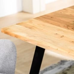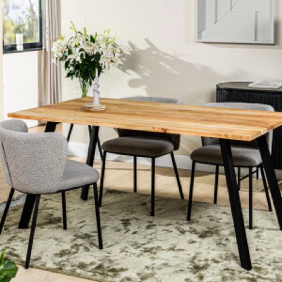 Deze trendy eetkamertafel is uitgevoerd in kwalitatief Acacia hout en een zwart metalen onderstel. Het robuuste onderstel is gemaakt van zwart gepoedercoat metaal. Het blad is uitgesneden in een rechthoekige vorm en het metalen frame bedekt de zijkant van de tafel dit geeft de tafel een stoere look. De combinatie van het elegante blad en het stoere onderstel zorgt ervoor dat de tafel in veel verschillende stijlen tot zijn recht komt. Deze tafel zorgt ervoor dat tafelen nog leuker wordt!