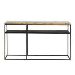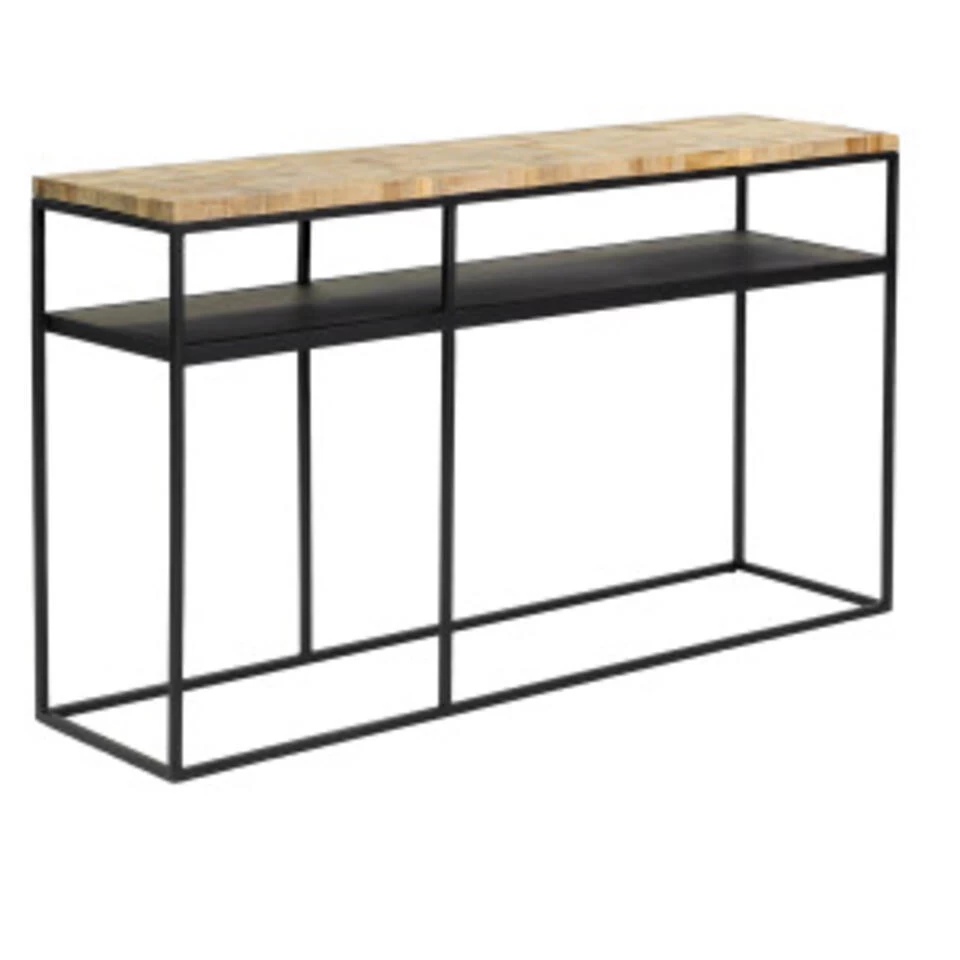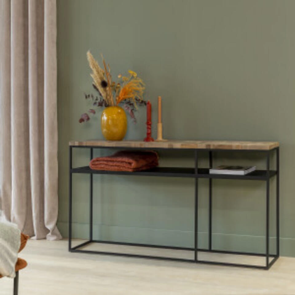 Deze trendy haltafel is gemaakt van teakhout met een visgraatpatroon en heeft een zwart metalen onderstel. Het hout is zorgvuldig geselecteerd en behandeld om een duurzaam en robuust oppervlak te creëren dat bestand is tegen dagelijks gebruik. De haltafel is smal en daarom perfect voor in iedere hal of kleinere ruimte. Door het metalen onderstel oogt het meubel heel ruim.Â