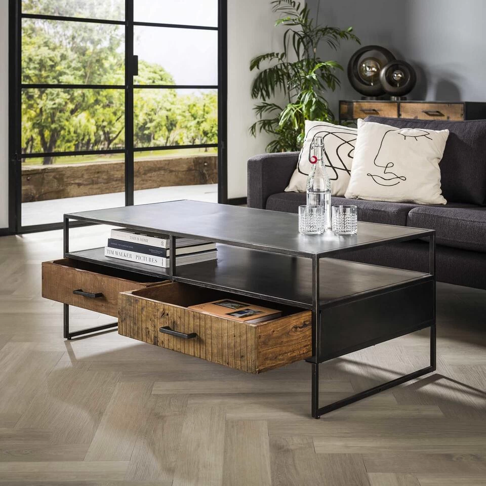Het frame van de industriële salontafel is gemaakt van metaal met een gun metal finish. Dit draagt ook bij aan de vintage stijl. De handvatten van de lades zijn ook gemaakt van metaal en dragen bij aan de industriële stijl. ​​​