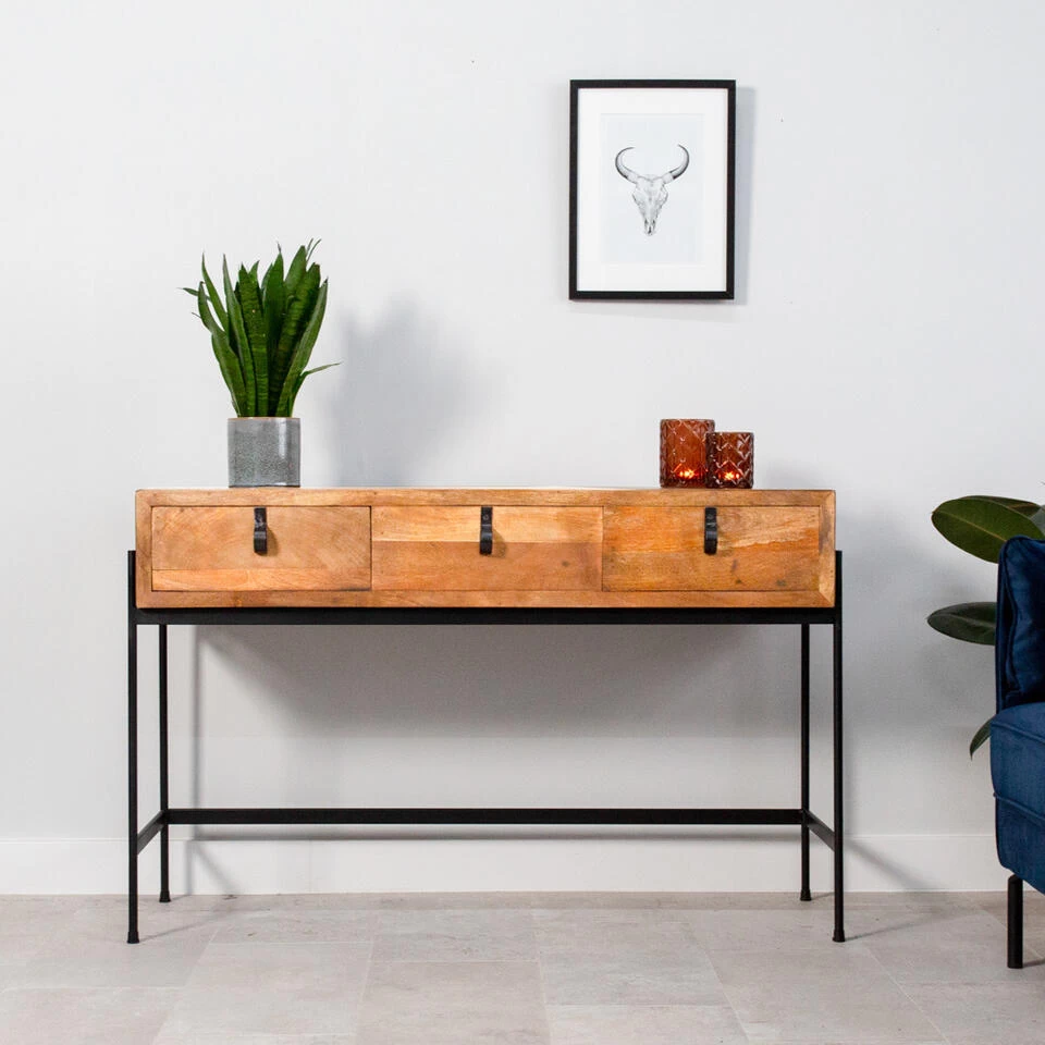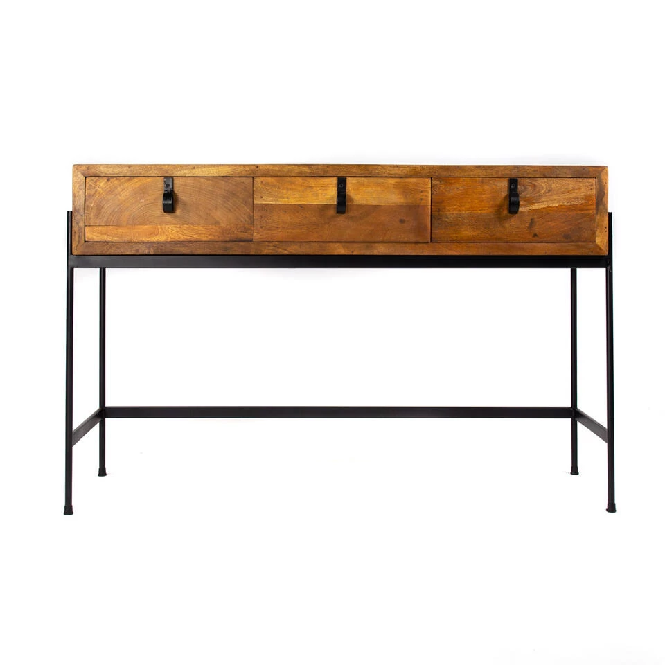 Sidetable Morgan staat op hoge poten gemaakt van zwart metaal. Ook het frame van Sidetable Morgan is gemaakt van zwart metaal. De combinatie van mangohout en zwart metaal is perfect voor ieder interieur. De handvatten van de lades zijn ook gemaakt van metaal en dragen ook bij aan de industriële stijl.