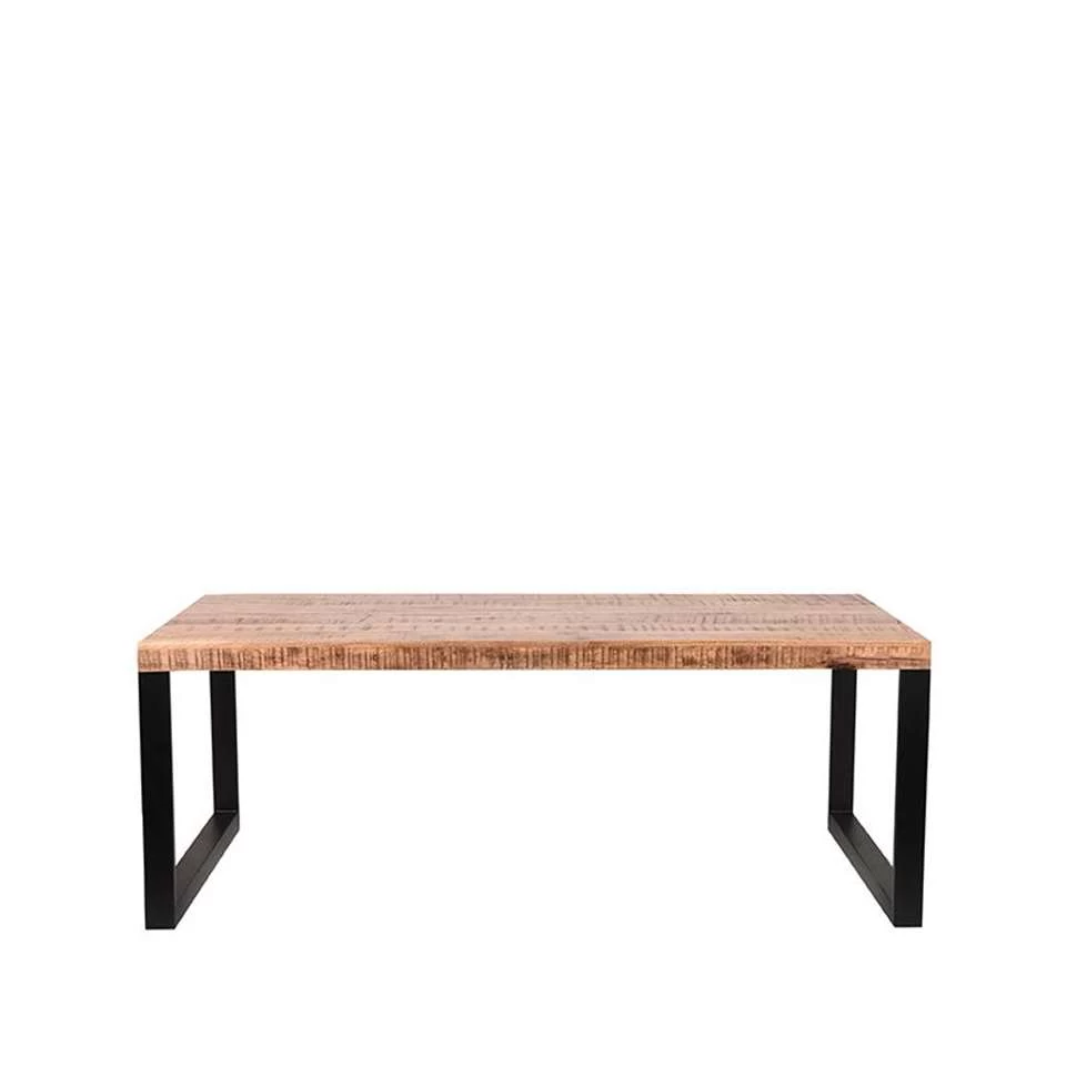 Eettafel Glasgow, uitgevoerd in de kleur rough is gemaakt van ruw, duurzaam mangohout. Glasgow heeft een bijzondere, individuele uitstraling door de unieke draad van het hout. Het zwart metalen frame zorgt voor een industriële en stoere touch.