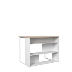 Dit meubel Slam is de perfecte oplossing voor wie in een beperkte ruimte toch een gezellig kook- en bareilandje met zitmogelijkheid wil creëren. Het meubel is uitgerust met 3 grote legplanken, waarop je eenvoudig en overzichtelijk je keukenmateriaal kan opbergen. Het onderstel is gemaakt uit een metaal dat tegelijk als licht en solide kan worden bestempeld. De hoogte van het gemelamineerde tafelblad bedraagt 90cm, waardoor je er gemakkelijk op kan werken. Het keukeneilandje, dat perfect dienst kan doen als bartafel, is gefabriceerd uit spaanplaat in een decor van Jackson Eik met een witte basis. Een topper voor een schappelijke prijs!
