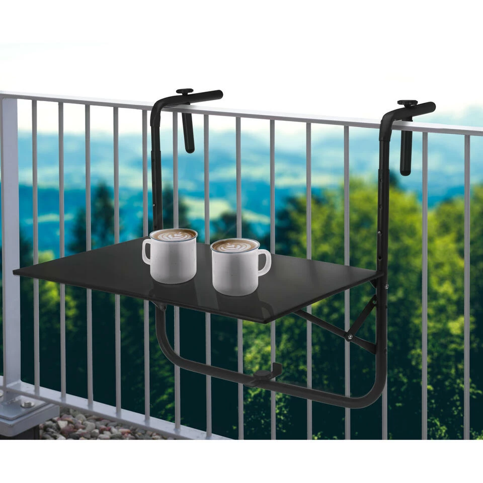 Balkon tafel metaal in de kleur mat antraciet. Een handige inklapbare en in hoogte verstelbare balkontafel, de ideale ruimtebesparende oplossing voor je balkon. Materiaal: metaal. Afmeting: 60 x 43 cm. Maximaal draaggewicht: 50 kg. Gewicht: 3,7 kg. Ophang tafel voor aan de railing.