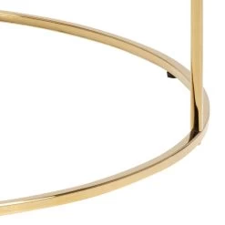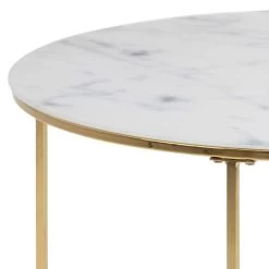 Salontafel Lousa is een stijlvolle salontafel in retrostijl. Deze tafel heeft een glazen tafelblad met marmerprint. Het frame is gemaakt van goudkleurig metaal. Op het bovenblad is ruimte voor bijvoorbeeld een hapje en een drankje.