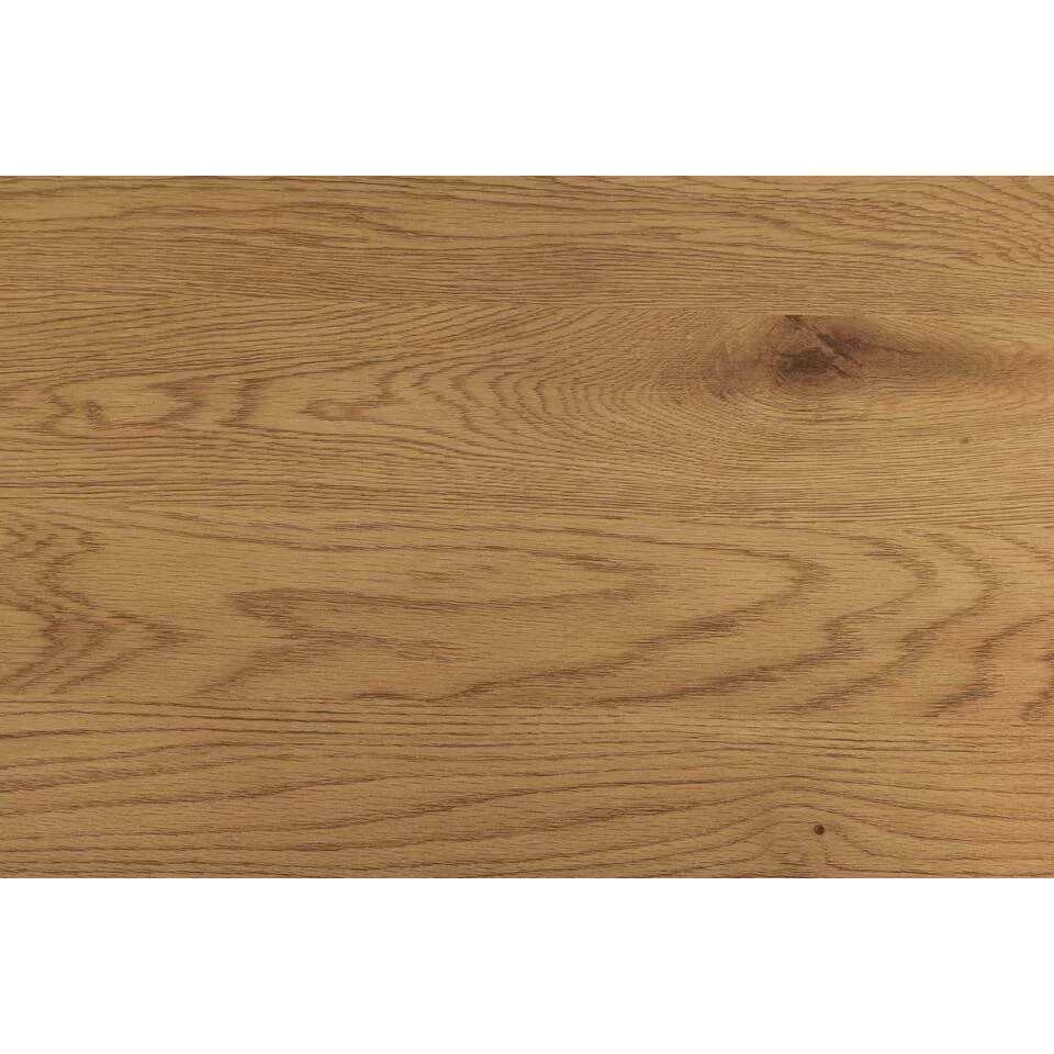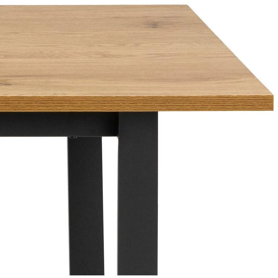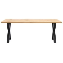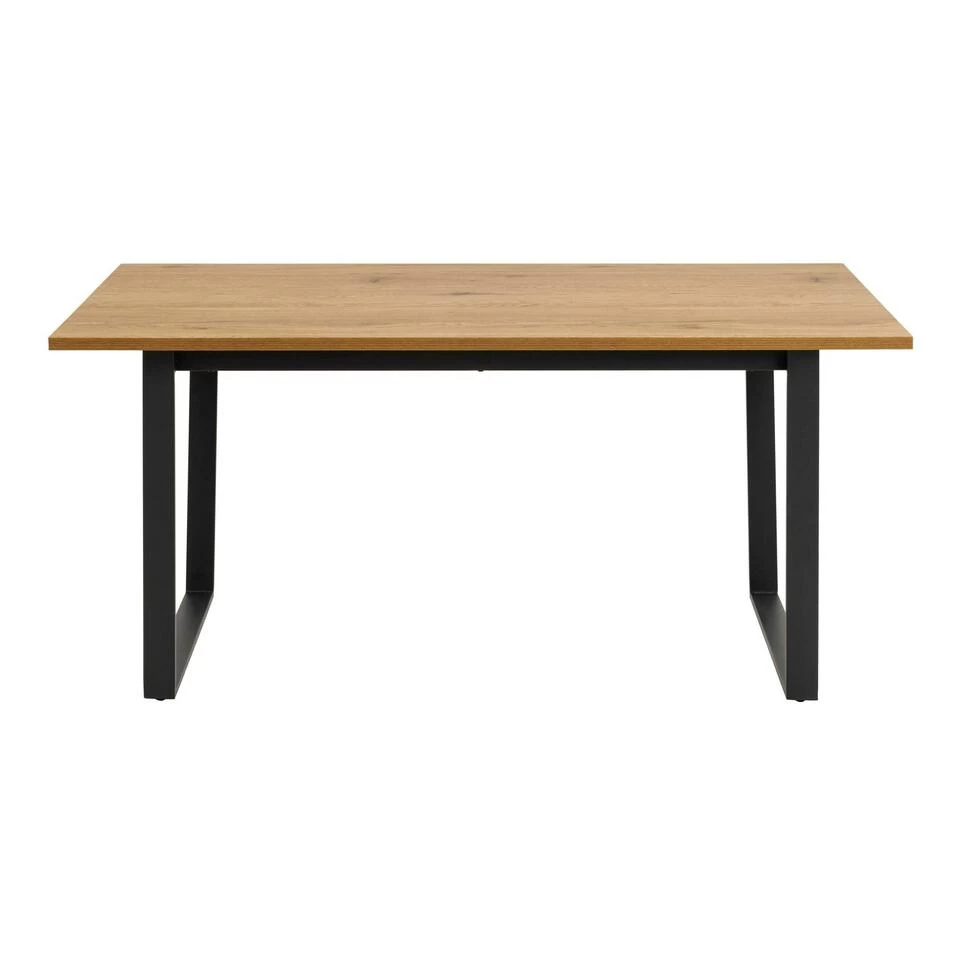 Met evenveel aandacht voor esthetiek als voor praktisch nut wordt de tafel al snel ieders lievelingetje. Het rechthoekige tafelblad is gehuld in een wilde eik-look die de tafel een warm en rustiek karakter geeft, terwijl het contrasterende U-vormige zwarte metalen onderstel een modern element vormt dat het ontwerp aardt. Beide materialen zijn gemakkelijk te onderhouden.