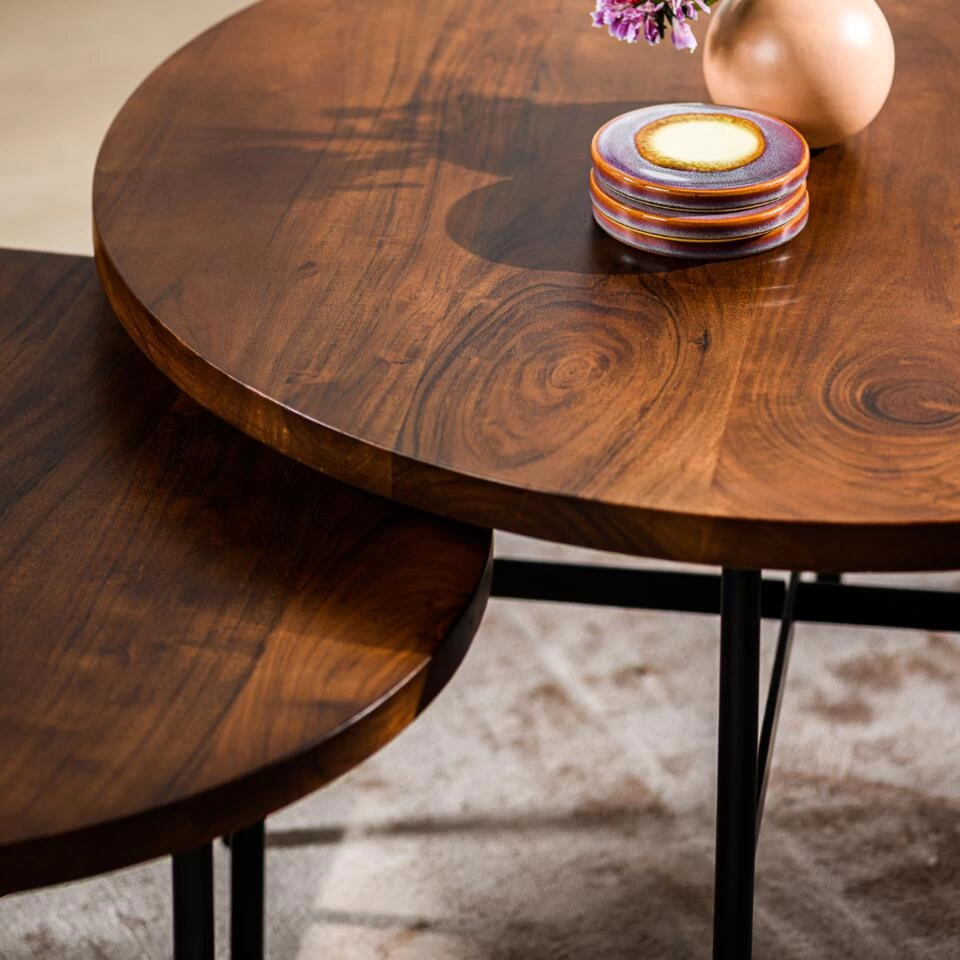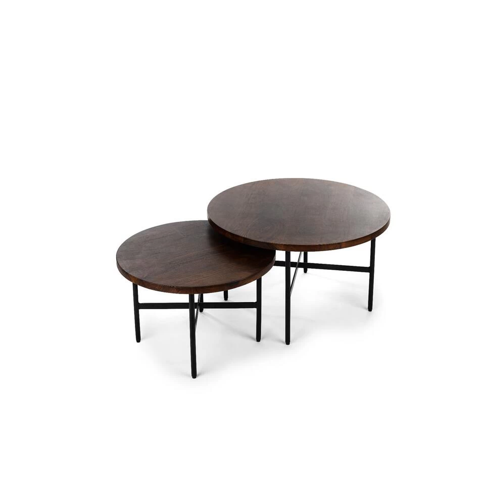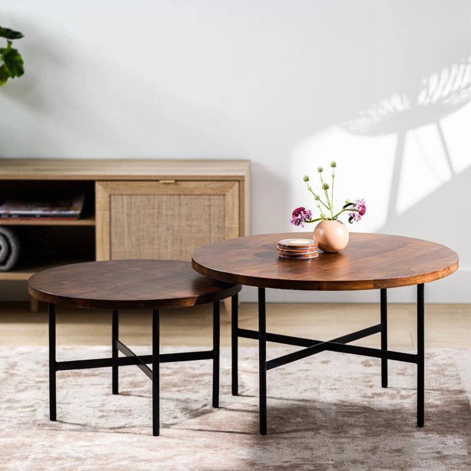 De Susanne salontafel rond kruis acaciahout bruin 75 cm bestaat uit twee ronde salontafels. Het blad is gemaakt van bruin acaciahout. De bladen zijn glad afgewerkt. De tafels verschillen in hoogte waardoor deze leuk (deels) onder elkaar kunnen worden geplaatst. Het onderstel bestaat uit vier rechte poten met kruis in zwart staal. Deze set past gemakkelijk binnen diverse woonstijlen. Gebruik de tafels naast elkaar als salontafelset of afzonderlijk van elkaar als twee losse bijzettafels. De afmetingen van de tafels van B75xD75xH44 cm en B60xD60xH39.
