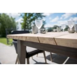 De poten van de Derby tuintafel zijn gemaakt van aluminium. Dit materiaal is qua gewicht lichter dan bijvoorbeeld teak hout. Dit zorgt er dus voor dat je de tafel met aluminium antraciet poten redelijk makkelijk kan verplaatsen met twee personen. De poten zijn antraciet van kleur wat erg mooi combineert bij het teak houten tafelblad.