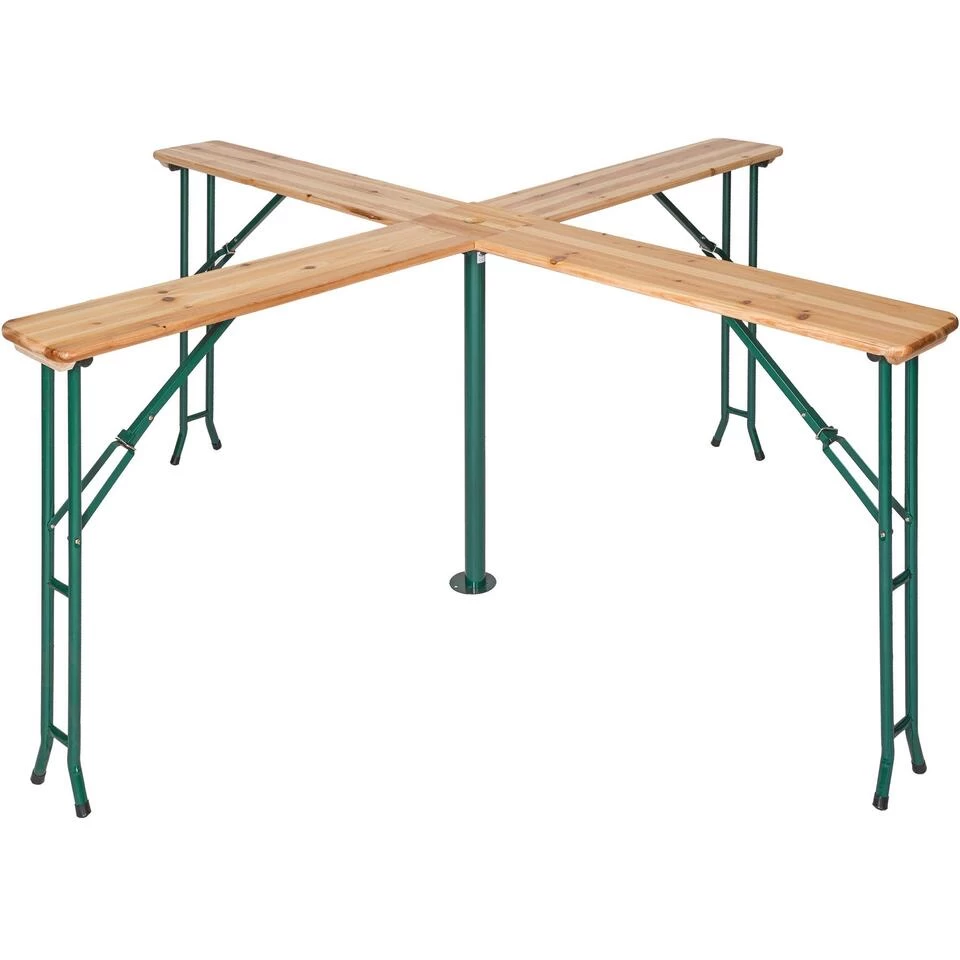Deze praktische bartafel in kruisvorm met biertafelontwerp mag op geen enkel tuinfeest meer ontbreken. Aan deze tafel is plaats voor tot 20 personen. De Quattro Biertenttafel is zeer stabiel en robuust vervaardigd. Hij kan met enkele handelingen opgeklapt worden en bijvoorbeeld in de kofferbak worden vervoerd. In het midden van de tafel is een gat uitgespaard waar een parasol kan worden geplaatst.