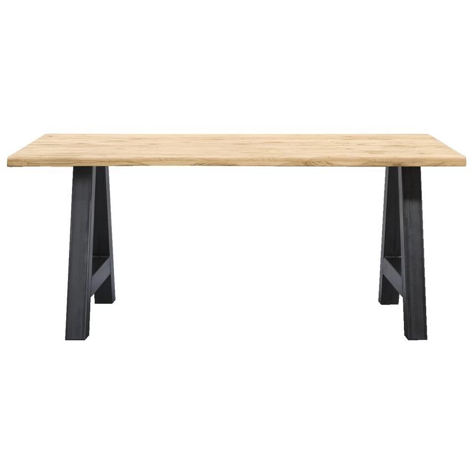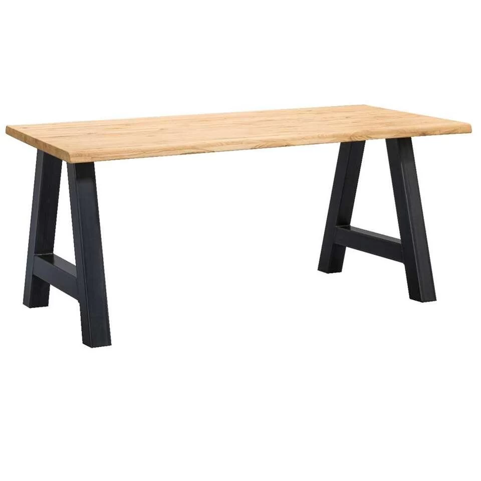 De eettafel heeft een massief eiken tafelblad met boomstamafwerking. Het blad rust op een stevig metalen frame, in de vorm van een A. Hout met metaal is al enige tijd een stoere en populaire combinatie! Het tafelblad heeft een afmeting van 180×90 cm. De tafel heeft een hoogte van 75 cm. Let dus op met het kopen van een bijpassende eetkamerstoelen met leuningen.