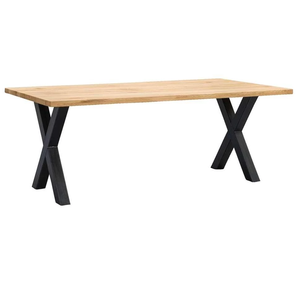 De eettafel heeft een massief eiken tafelblad. Daaronder zit een stevig metalen onderstel, in de vorm van een X. Hout met metaal is al enige tijd een stoere en populaire combinatie! Het tafelblad heeft een afmeting van 200×100 cm. De tafel heeft een hoogte van 75 cm. Let dus op met het kopen van een bijpassende eetkamerstoelen met leuningen.
