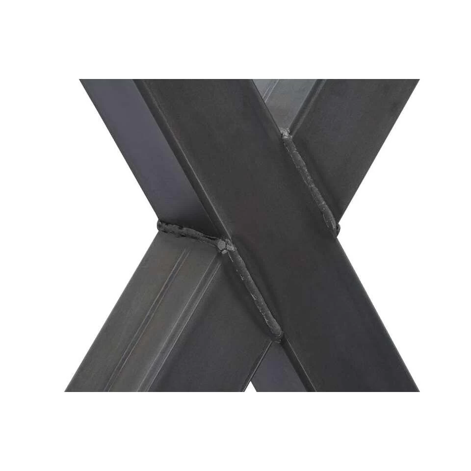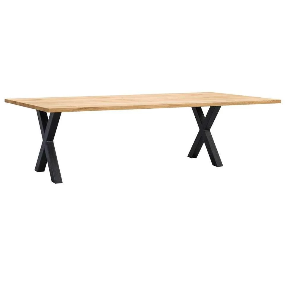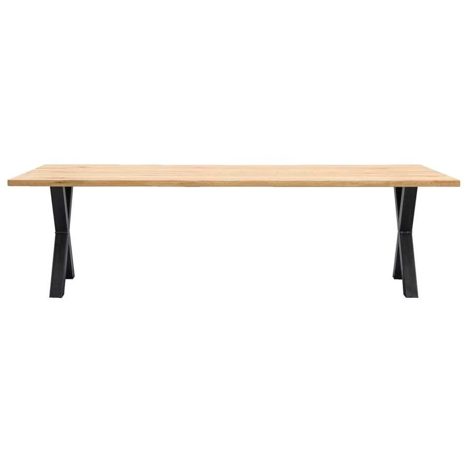 De eettafel heeft een massief eiken tafelblad. Daaronder zit een stevig metalen onderstel, in de vorm van een X. Hout met metaal is al enige tijd een stoere en populaire combinatie! Het tafelblad heeft een afmeting van 220×100 cm. De tafel heeft een hoogte van 75 cm. Let dus op met het kopen van een bijpassende eetkamerstoelen met leuningen.