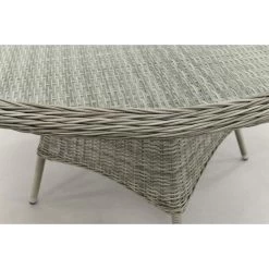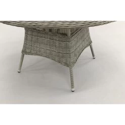 De ronde tuinstafel heeft een mooie half rond vlechtwerk, dit vlechtwerk wordt ook wel wicker genoemd. Het vlechtwerk heeft een licht grijs wat de ronde tuinset een stijlvolle uitstraling geeft.Â