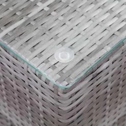Deze bijzettafel is gemaakt van weerbestendig poly rattan, een metalen frame en een glazen tafelblad, waardoor hij slijtvast is en dagelijks kan worden gebruikt. Dankzij de lichtgewicht constructie is hij gemakkelijk te verplaatsen. Bovendien kan de accenttafel dienen als salontafel, theetafel, enz. Hij is gemakkelijk schoon te maken met een vochtige doek.