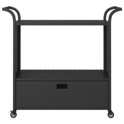 Deze trolley is gemaakt van poly rattan en is weerbestendig en onderhoudsvrij. Hij is geschikt voor dagelijks gebruik. De kar heeft een lade om te voorkomen dat etenswaren op de grond vallen. Het gepoedercoat stalen frame houdt de serveerwagen stabiel en stevig. De handvatten aan de bovenkant maken het makkelijk om hem te duwen en te trekken. Dankzij de soepel rollende wielen is de trolley moeiteloos te verplaatsen. Daarnaast hebben twee van de zwenkwielen een vergrendelingsfunctie om te voorkomen dat de kar wegrolt.