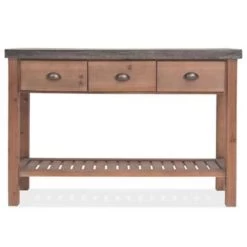 Deze duurzame tafel is gemaakt van massief vurenhout met een gegalvaniseerd stalen blad. Het gegalvaniseerde staal kan enkele onvolkomenheden vertonen, die niet opzettelijk zijn gemaakt maar toch bijdragen aan de industriële charme. De 3 lades en de onderste schap bieden voldoende opbergruimte voor verschillende voorwerpen. De combinatie van hout en staal draagt bij aan de industriële en vintage stijl van de tafel.
