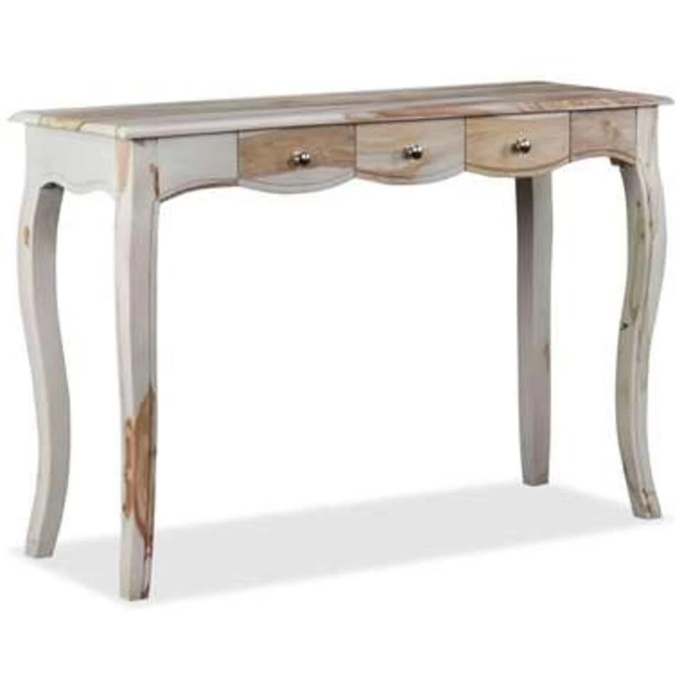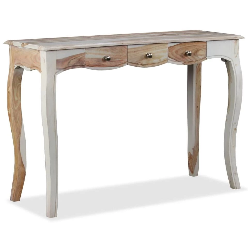 Deze wandtafel is gemaakt van massief sheeshamhout. Sheesham wordt ook wel palissander genoemd en is een tropisch hardhout dat bekend staat om zijn mooie nerven. Deze tafel heeft een stevig tafelblad waar je een fruitmand, een vaas en andere decoratieve spulletjes op kunt zetten. De sterke houten poten dragen bij aan de stevige constructie. De 3 lades bieden voldoende ruimte om allerlei kleinere spulletjes georganiseerd en binnen handbereik te houden. De tafel is volledig handgemaakt en de prachtige houtnerven maken ieder meubelstuk uniek en nét iets anders dan de rest. Montage is eenvoudig.